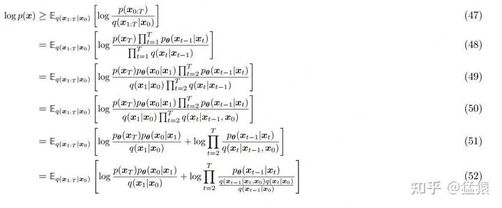 (48):分子上, 因为 已是个近似高斯分布的纯噪声, 因此它的分布 是已知的, 和模型 无关, 所以将 单独提炼出。分子与分母的其余项则是因为扩散模型遵循马尔可夫链性质, 因此可以通过链式连乘规则进行改写