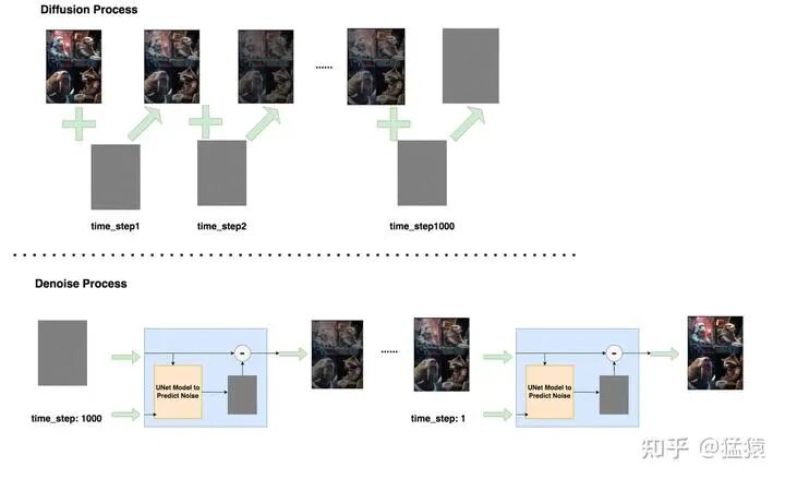 此刻!是不是一道光在你的脑海里闪过! 一切都串起来了,也就是说,只要在denoise的过程中,让模型去预测噪声,就可以达到让“模型产生图片的分布”和“真实世界的图片分布”逼近的目的!