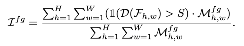 在得到discriminability score后,我们计算出其对于前景和背景的响应程度,使用IoF-IoB曲线进行了定量分析,IoF和IoB的计算方式类似,如下公式。