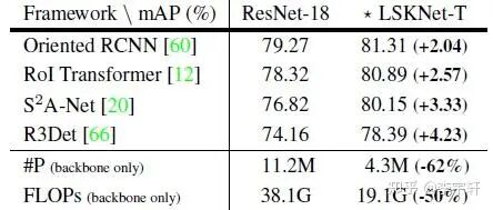 在相同检测框架的不同骨干网络(大卷积核和选择性机制的骨干网络)中,在相似模型复杂的的前提下,我们的LSKNet骨干mAP更强!(表2)