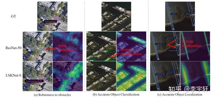 图5所示,LSKNet-S可以捕捉到更多与检测到的目标相关的背景信息,从而在各种困难情况下有更好的表现,这证明了我们的先验(1)。