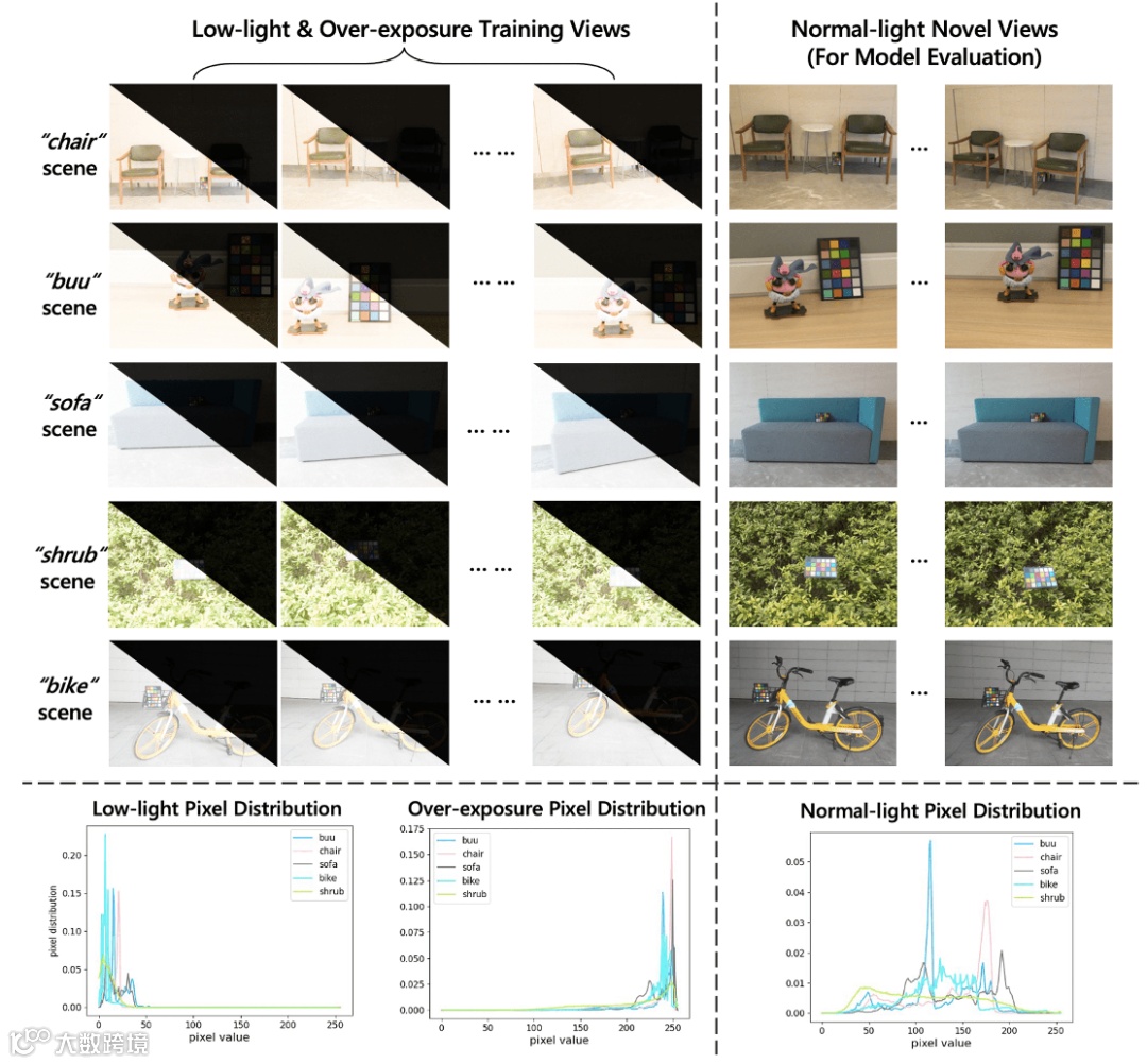关于数据集方面,我们提出了一个成对的低光照/过曝光/正常光照的multi-view数据集(LOM数据集),以便大家进行后续研究,低光照和过曝光的图像用于训练模型,正常光照的图像用于Novel View Synthesis的验证,相比于2D图像增强以及视频增强,这一任务更具挑战性,因为需要在图像增强的同时来确保生成图像的multi-view一致性,数据集图片如下,我们通过相机采集了五个真实世界的场景 (buu, chair, sofa, bike, shrub),每个场景都包含有25~65张multi-view图像,每个图像都有三组不同曝光条件(低光照/过曝光/正常光照)。