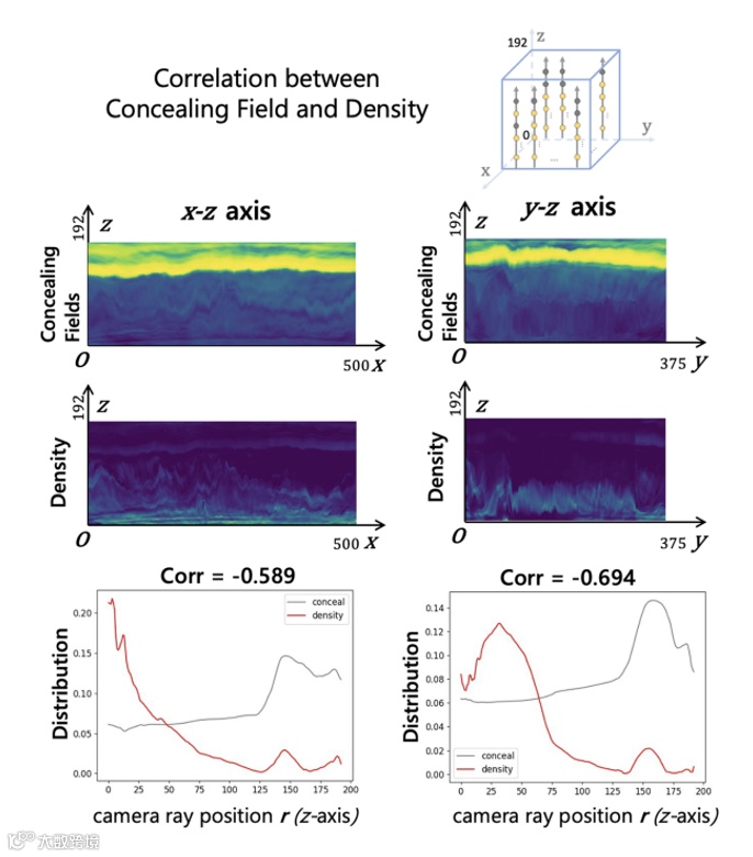 经过我们的实验发现, Concealing Field的生成范围和Volume Rendering中粒子Density的范围呈反比例关系,这意味着训练过程中Concealing Field更倾向于出现在没有物体的地方,与我们对Concealing Field存在空气中的假想一致。