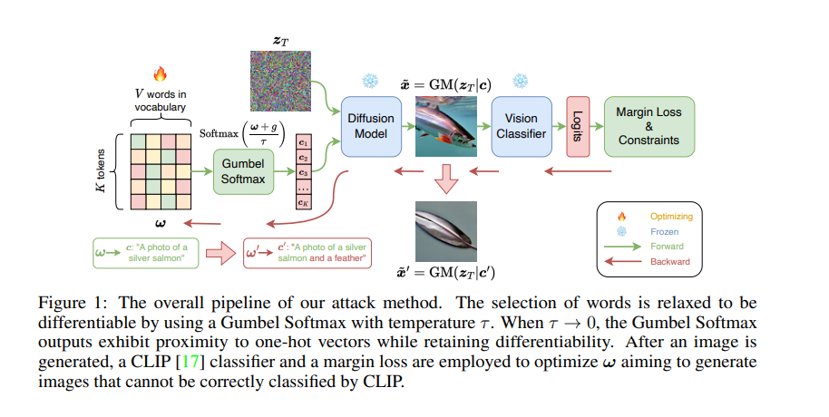 如下图 1 所示,在不改变提示中原本目标名词的前提下,研究者通过学习 Gumbel Softmax 分布,将单词替换或扩展的离散过程连续化,从而确保扰动生成的可微分性,生成图像后,使用 CLIP 分类器和 margin loss 来优化 ω,旨在生成 CLIP 无法正确分类的图像,为了确保攻击性提示与干净提示具有一定的相似性,研究着近一步使用了语义相似性约束和文本流利度约束。