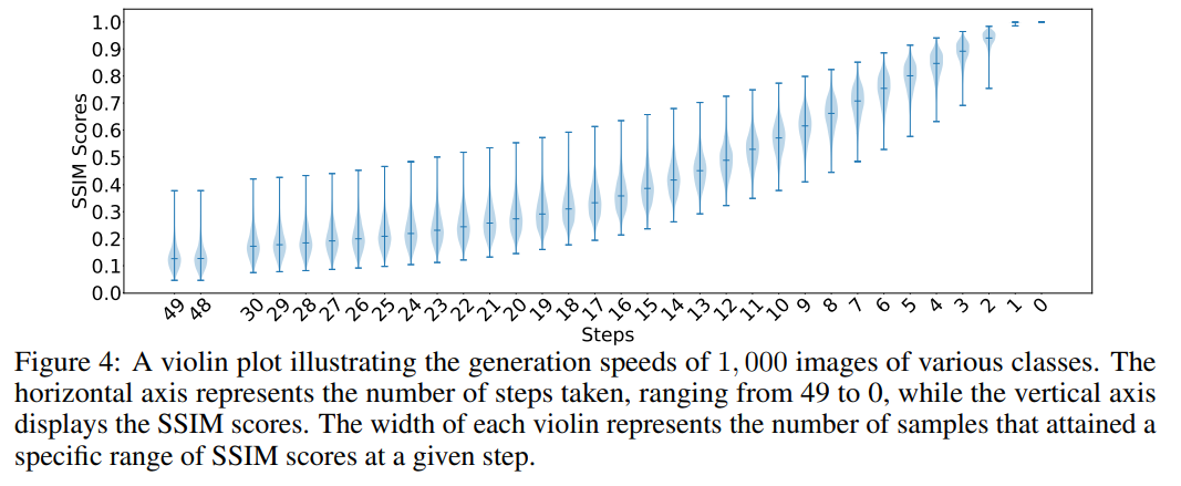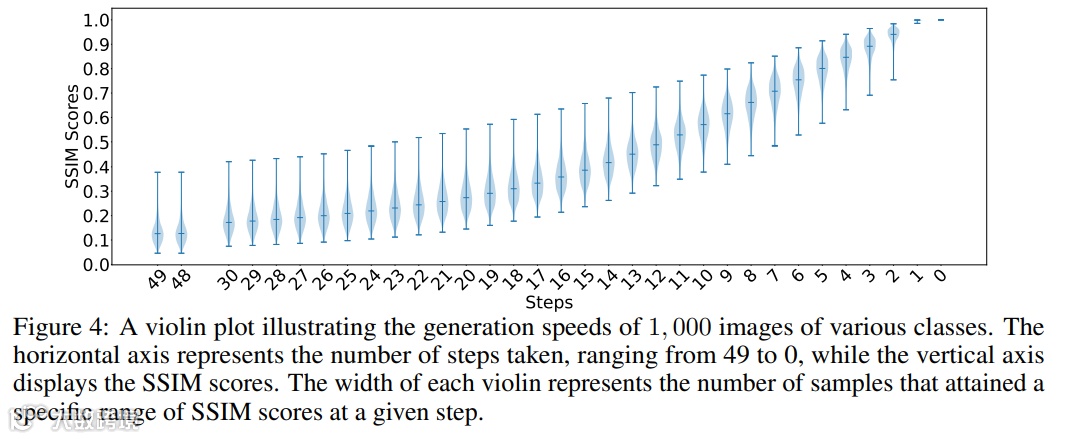 当一个提示(prompt)包含多个生成目标时,常常会遇到某个目标在生成过程中消失的问题。理论上讲,同一个提示内的所有目标都应该共享同一个初始噪声。如图 4 所示,研究者们在固定初始噪声的条件下,生成了 ImageNet 上的一千个类别目标。他们将每个目标生成的最后一张图像作为参考图像,并计算了在每个时间步长上生成的图像与最后一步生成的图像的结构相似性指数(SSIM)得分,以此展示了不同目标生成速度的差异。