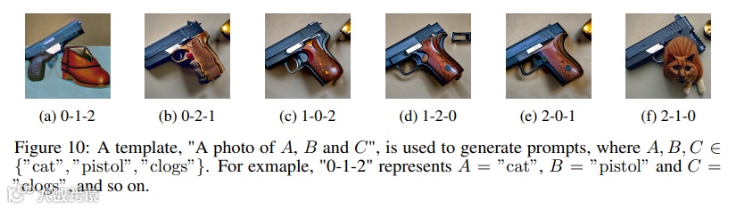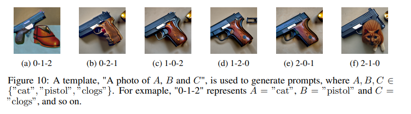 在图 10 中,研究者观察到了一个有趣的现象。虽然从人类的视角来看,那些不同顺序排列的 prompt 大体上含义相同,都是在描述一个既有猫,又有木屐和手枪的图片。然而,对于语言模型,也就是 CLIP 文本编码器来说,词语的顺序在一定程度上影响了其对文本的理解,这种影响反过来又会改变生成图片的内容。这种现象说明,尽管我们的描述在语义上是一致的,但模型却可能因为词语的顺序不同而产生不同的理解和生成结果。这不仅揭示了模型处理语言和理解语义的方式与人类存在差异,同时也提示我们在设计和使用这类模型时,需要更加考虑词语顺序的影响。