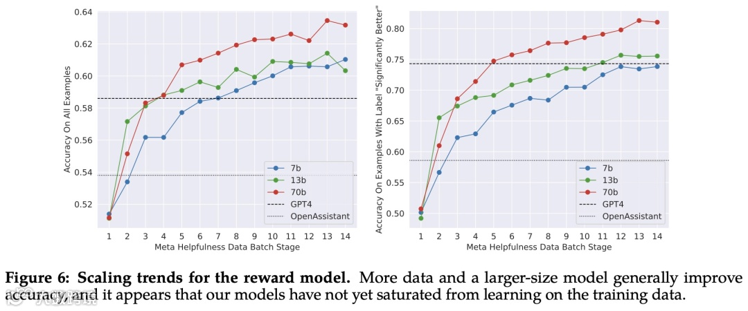 缩放趋势。Meta 研究了奖励模型在数据和模型大小方面的缩放趋势,在每周收集的奖励模型数据量不断增加的情况下,对不同的模型大小进行了微调。下图 6 报告了这些趋势,显示了预期的结果,即在类似的数据量下,更大的模型能获得更高的性能。