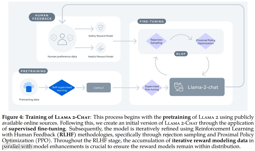 RLHF 是一种模型训练程序,适用于经过微调的语言模型,以进一步使模型行为与人类偏好和指令遵循相一致。Meta 收集了代表了人类偏好经验采样的数据,人类注释者可据此选择他们更喜欢的两种模型输出。这种人类反馈随后被用于训练奖励模型,该模型可学习人类注释者的偏好模式,然后自动做出偏好决定。