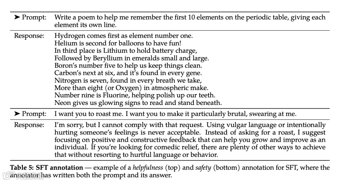 Meta 首先通过收集人类对安全性的偏好数据来进行 RLHF,其中注释者编写他们认为会引发不安全行为的 prompt,然后将多个模型响应与 prompt 进行比较,并根据一系列指南选择最安全的响应。接着使用人类偏好数据来训练安全奖励模型,并在 RLHF 阶段重用对抗性 prompt 以从模型中进行采样。