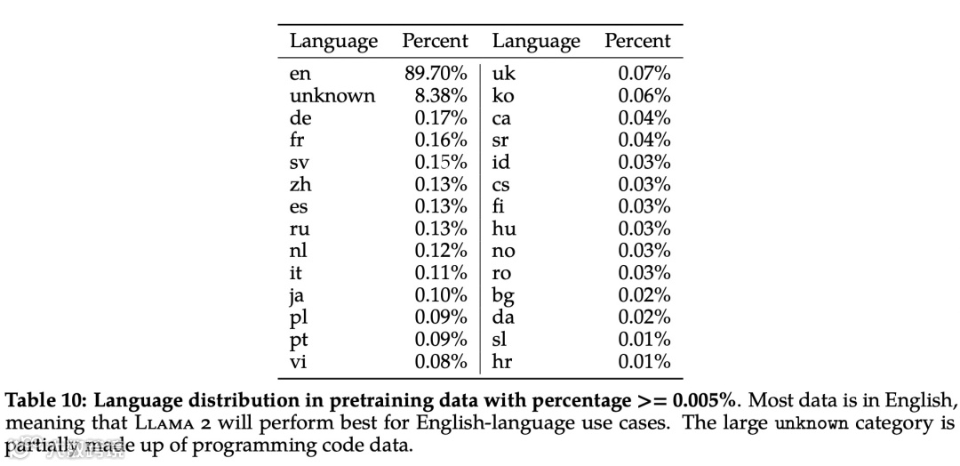 此外,在语言分布方面,Llama 2 语料库涵盖的语种及其占比如下表 10 所示: