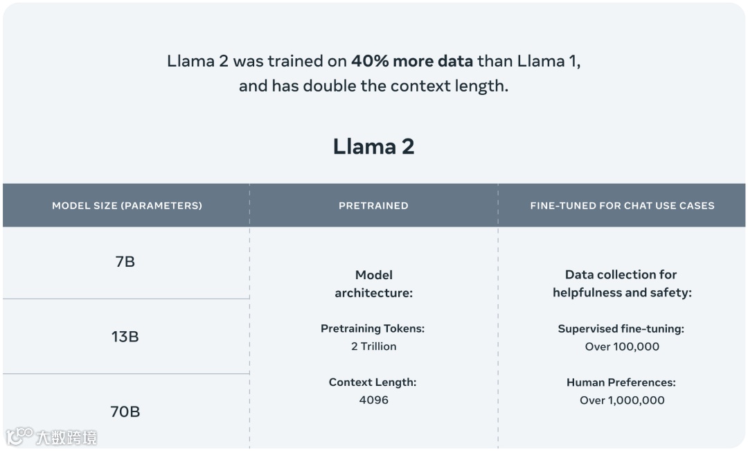 包含 70 亿、130 亿和 700 亿三种参数变体,此外还训练了 340 亿参数变体,但并没有发布,只在技术报告中提到了。