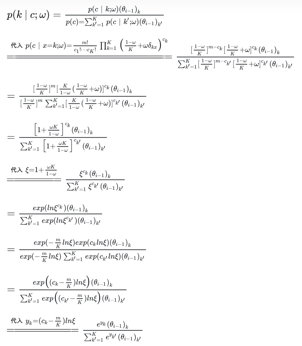 以上第2步是代入了多项分布的概率质量函数(具体推导过程见附录1), paper 中少了 次幂(见 paper 的式 (134), 作者你能不能走点心..), 最后1步是将式 代入。在 paper 中, 的下标为 , 但其实应该是 (CW 不禁怀疑作者是不是喝多了)。