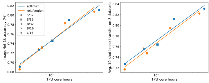 如下图2所示说明了 ReLU-attention 与 ImageNet-21K 训练的 Softmax-attention 的缩放趋势相匹配。x 轴表示实验所需的总 core hours。ReLU-attention 的优势是能够以比 Softmax-attention 以更少的 gather 操作对序列长度维度进行并行化。