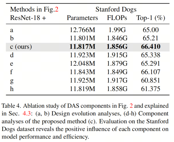 表3表明,添加Triplet注意力略微提高了ResNet-18在CIFAR100上的准确率(0.3%),但在Stanford Dogs数据集上降低了1.36%。然而,DAS在CIFAR100和Stanford Dogs上的ResNet-18准确率分别提高了0.79%和4.91%。