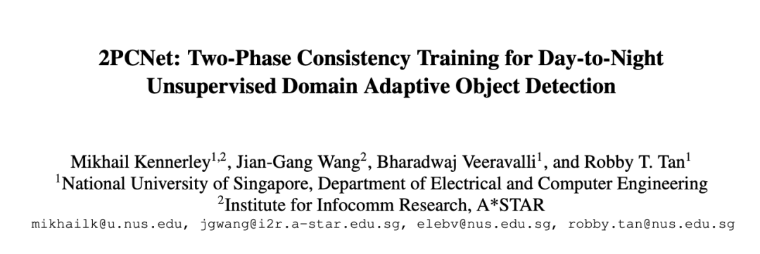 为了解决这个问题,本文2PCNet给出了一个二阶段一致非监督域自适应网络(two-phase consistency domain adaption network)用于夜间目标检测。本文网络将在第一阶段预测的高置信度为标签边界框与学生RPN提出的区域合并。然后教师在第二阶段使用合并后的建议框生成一组新的为标签。通过该方法提供了高置信度和低置信度伪标签组合。然后将这些为标签与学生生成的预测进行标签。这里需要使用加权一致性损失确保无监督损失高权重是基于可靠为标签,但允许较不可靠的伪标签参与训练。