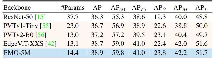 实验设置: ImageNet-1K 预训练的 EMO 模型,检测模型使用 SSDLite 和 RetinaNet,数据集使用 MS-COCO 2017,结果如下图6和图7所示。EMO 优于同类方法,而且优势明显。比如,配备 EMO-1M 的 SSDLite 实现了 22.0的 mAP,且只有 0.6G FLOPs 和 2.3M 的参数。EMO-5M 获得了最高的 27.9 mAP,且 FLOPs 更少 (少于 MobileViT-S 的 3.4G 和 EdgeNeXt-S 的 0.3G)。