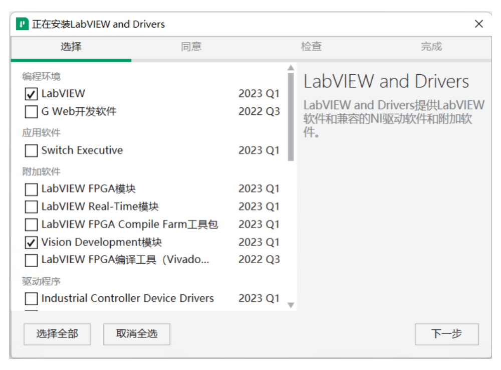 LabVIEW请从https://www.ni.com/zh-cn/support/downloads/software-products/download.labview.html,下载LabVIEW安装文件。需要注意的是:请选择LabVIEW 64位版本,并勾选Vision Development模块和NI-IMAQdx。