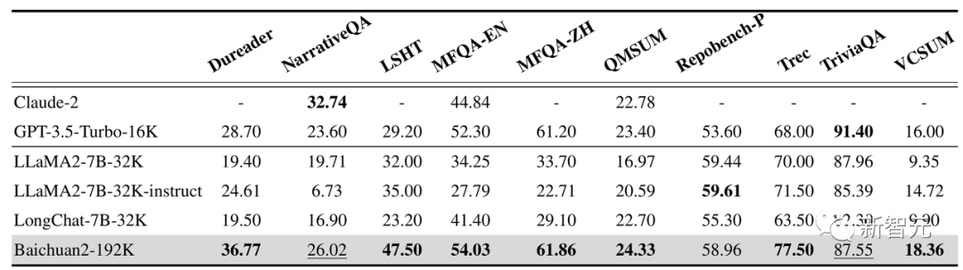 此外,Baichuan2-192K在Dureader、NarrativeQA、LSHT、TriviaQA等10项中英文长文本问答、摘要的评测集上表现同样优异。
