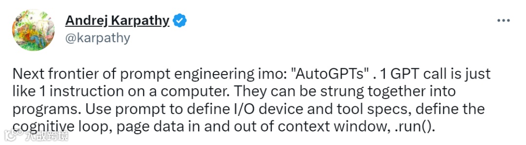 就连前特斯拉 AI 总监、刚刚回归 OpenAI 的 Andrej Karpathy 对此都评价道:「AutoGPT 是 prompt 工程的下一个前沿。」