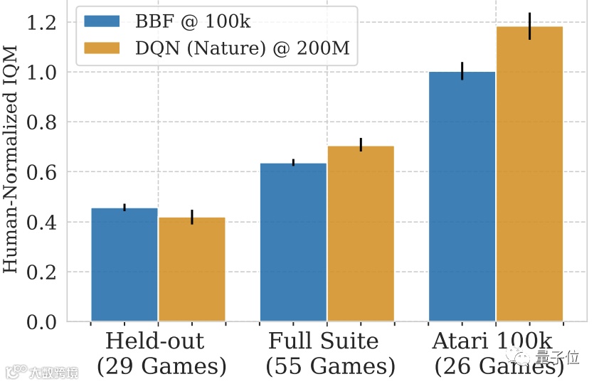 即使加上其他没有训练过的雅达利游戏,BBF也能取得超过人类一半的分数IQM分数。