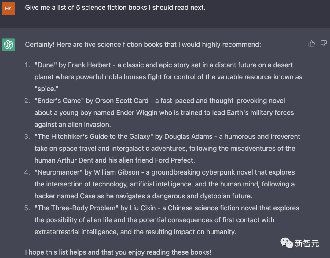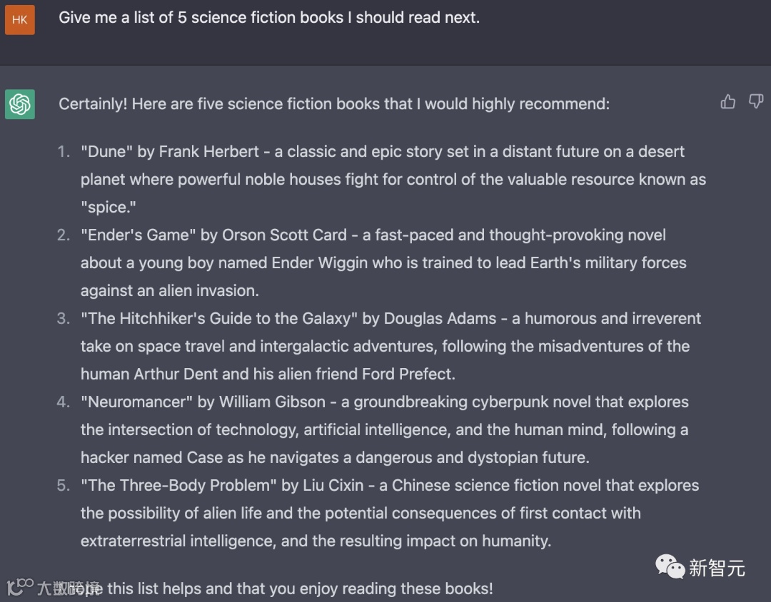 ChatGPT对于该问题给出了更加丰富的回答,不仅包括书名和作者,还对每一本书的内容、类型作了简要评述和介绍。