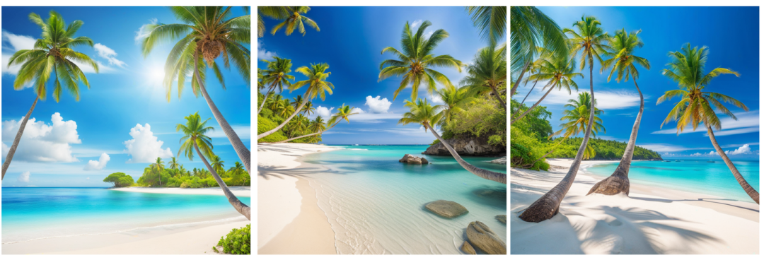 示例二:天堂海滩风格 Prompt:Serene beach scene with crystal clear water and white sand, tropical palm trees swaying in the breeze, perfect paradise, seascape