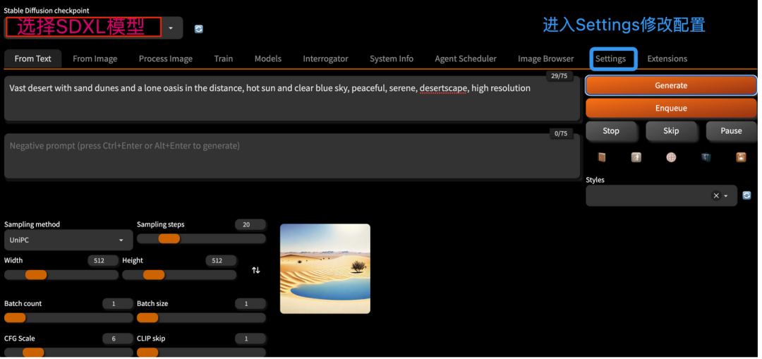 进入SD.Next可视化界面后,我们可以在红色框中选择模型,然后需要修改Settings中的配置,来让SD.Next能够加载Stable Diffusion XL模型。