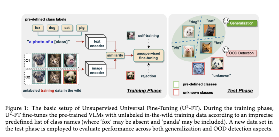 以图下图所示的例子说明,假设有一个包含三个类别(即“狗”、“猫”和“熊猫”)样本的未标记数据集 。然而,提供的预定义类名列表可能不准确,包含四个类别(即“狐狸”、“狗”、“猫”、“猪”)。通常情况下,U -FT要求微调模型在两个方面表现出优越性能,即识别预定义列表中类别的样本(“狗”和“猫”),以及识别不在列表中的类别的样本(“熊猫”),通常称为超出分布(OOD)样本。