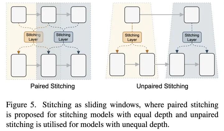 我们以DeiT为例,在相同depth的缝合实验上采取了Paired Stitching这种策略。这种策略的启发来自于过去一些工作发现:相邻layer之间的representation是有较高的相似度的。所以我们选择在DeiT得相邻blocks中share同一个stitching layer,如滑窗一般进行stitching。