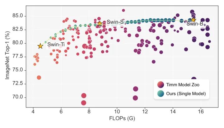 此时,我们把原先model family中的网络叫做anchors,缝合出来的新网络叫做stitches。单个SN-Net可以cover众多FLOPs-accuracy的trade-off,如在基于Swin的实验中,一个SN-Net的可以挑战timm中200个独立的模型,整个实验不过是50 epochs,八张V100上训练不到一天。