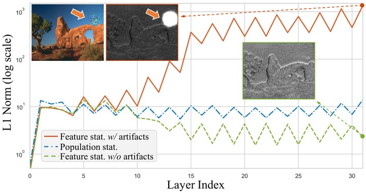 另外作者观察了有伪像的位置,BN 层统计信息,和无伪像的位置的方差的 范数曲线。观察到无伪像的位置的方差量级和 BN 层统计方差量级接近,但是有伪像的位置的方差量级和 BN 层统计方差量级差距拉大。因此在除以方差时由于不正常的方差的量级导致了伪像的形成。