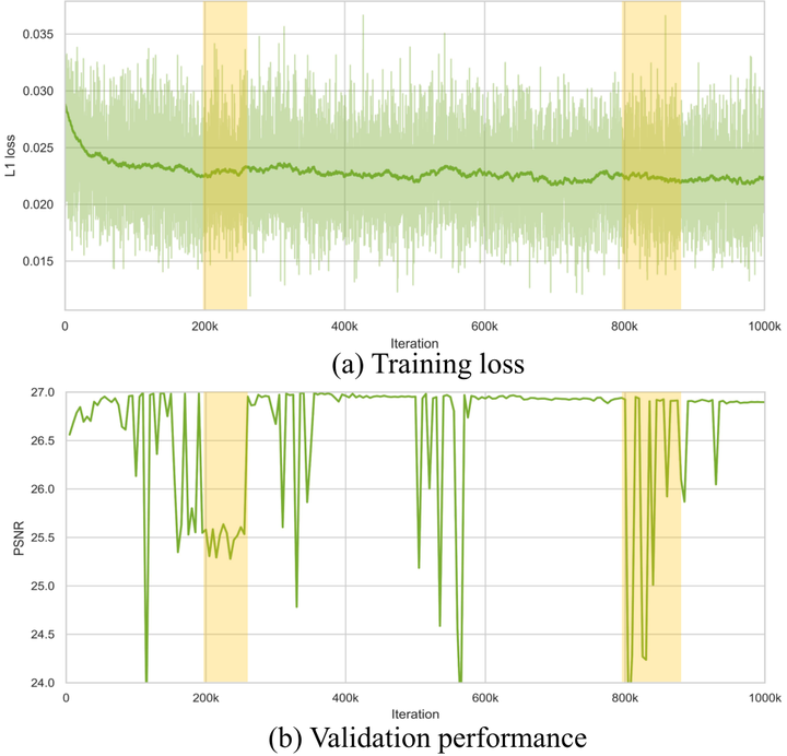 然而,如图 7 所示,BN 对 SR 任务是不友好的。它倾向于在推断过程中引入令人不愉快的伪像。这种伪像表现为输出中混杂着不自然的色彩,导致 PSNR 大幅下降。因此,在诸如 ESRGAN[9] 的一些经典工作中一般都将 BN 移除。