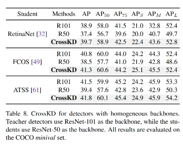 除了前述同构骨干外,作者进一步验证了异构骨干下Cross的性能,可以看到: