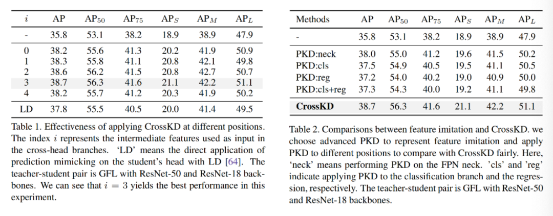 上表1对CrossKD的实施位置进行了消融分析,可以看到: