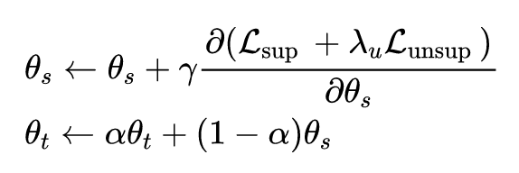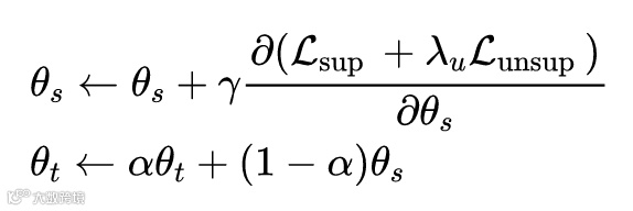 其中 用于调节无监督学习占整体任务的贡献。在训练期间, 教师网络的参数 通过指数移动平均线( EMA) 从学生网络的 进行更新, 可以简单的表示为: