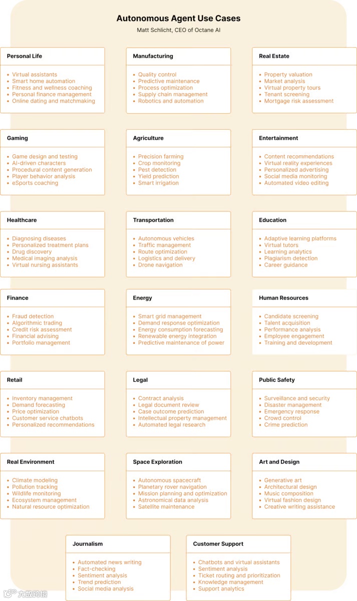 这些自主智能体将存在于每个行业并可运用在每项可以想象的任务中。下图展示的只是少数几个例子: