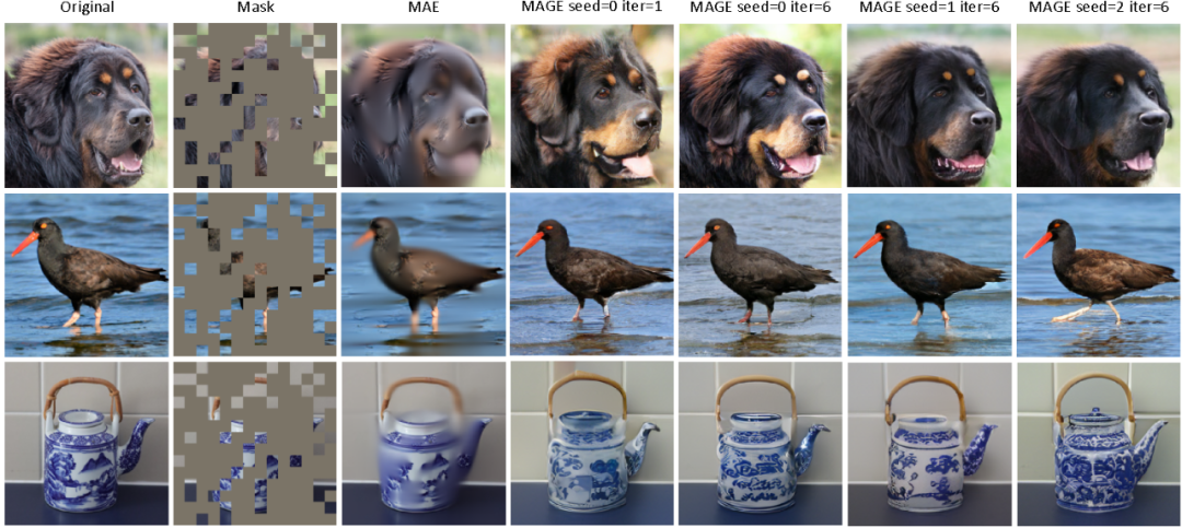 针对上述问题,本文作者提出了 MAGE(Masked Generative Encoder),首次实现了统一的图像生成和特征提取模型。与MIM直接作用于图像的掩码方法不同,MAGE 提出了基于图像语义符的 masked image token modeling 方法。如图所示,MAGE 首先使用 VQGAN [3] 编码器将原始图像转换为离散的语义符。之后,MAGE 对其进行随机掩码,并使用基于 transformer 的 encoder-decoder 结构对掩码进行重构,重构后的语义符可以通过 VQGAN 解码器生成原始图像。通过在训练中使用不同的掩码率,MAGE 可以同时进行生成模型(接近 100% 掩码率)和表征学习(50%-80% 掩码率)的训练。如图 1 所示,MAGE 重建出的图像不仅具有与原始图像一致的语义信息,还能够同时保证生成图像的多样性与真实性。