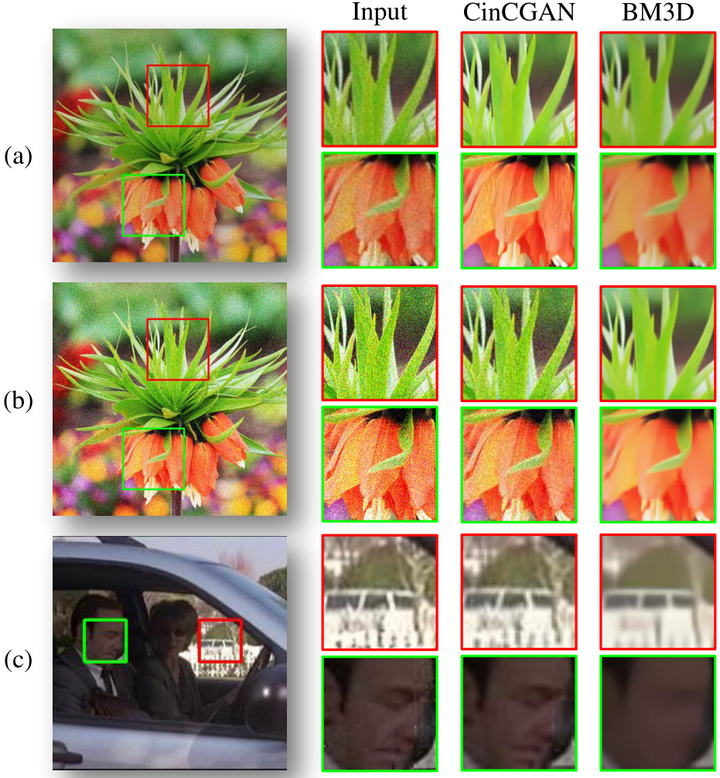 作者把数据 (a),(b),(c) 分别输入两个模型 CinCGAN 和 BM3D 中。得到下图1的结果。结果发现: