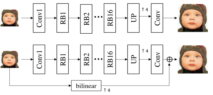 基于以上发现,作者很好奇这种退化相关的语义信息是否在 SR 网络中是普遍存在的。因此,作者设计了一个通用的基于 GAN 的 SR 架构 SRGAN-wGR (wGR 和 woGR 的意思分别表示网络是否有全局残差,区别如下图3) 来重复可视化实验。SRGAN-wGR 只使用 DIV2K 数据集来进行训练,LR 图片只使用双三次下采样,没有其他退化作用。作者使用3个不同退化类型的数据集进行测试:1) DIV2K-clean:DIV2K 的原始验证集。2) DIV2K-blur:在 DIV2K-clean 数据集上添加高斯模糊核,从而使其包含额外的模糊退化。对于每幅图像,kernel width 从 [2, 4] 中随机采样,kernel size 固定为15×15。3) DIV2K-noise:在 DIV2K-clean 数据集上添加高斯噪声,从而使其包含额外的噪声信息。噪声水平从 [5, 30] 中随机采样。