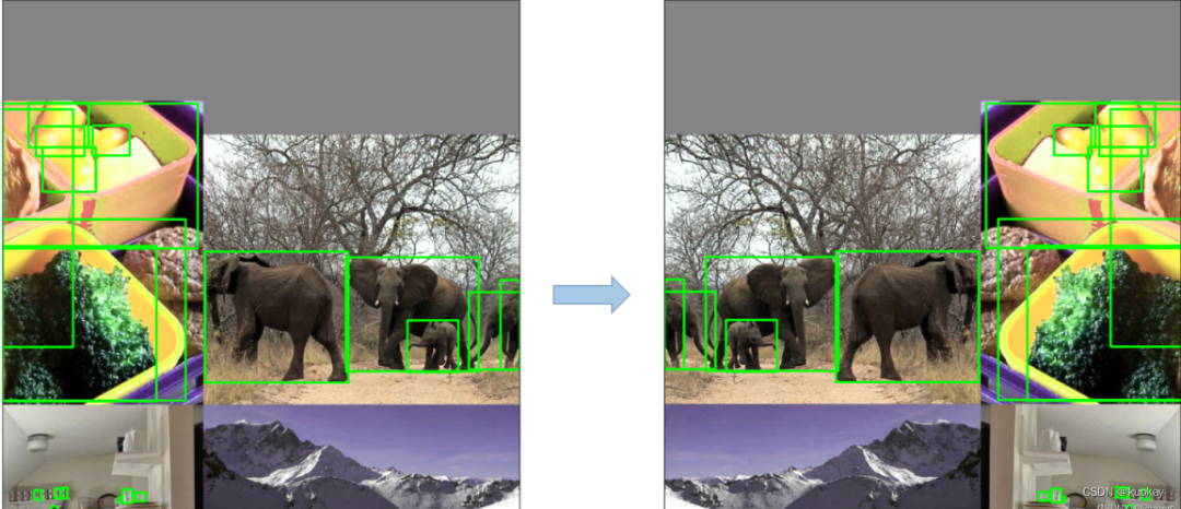 将四张图片拼成一张图片,采用随机缩放、随机裁剪、随机排布的方式进行拼接。