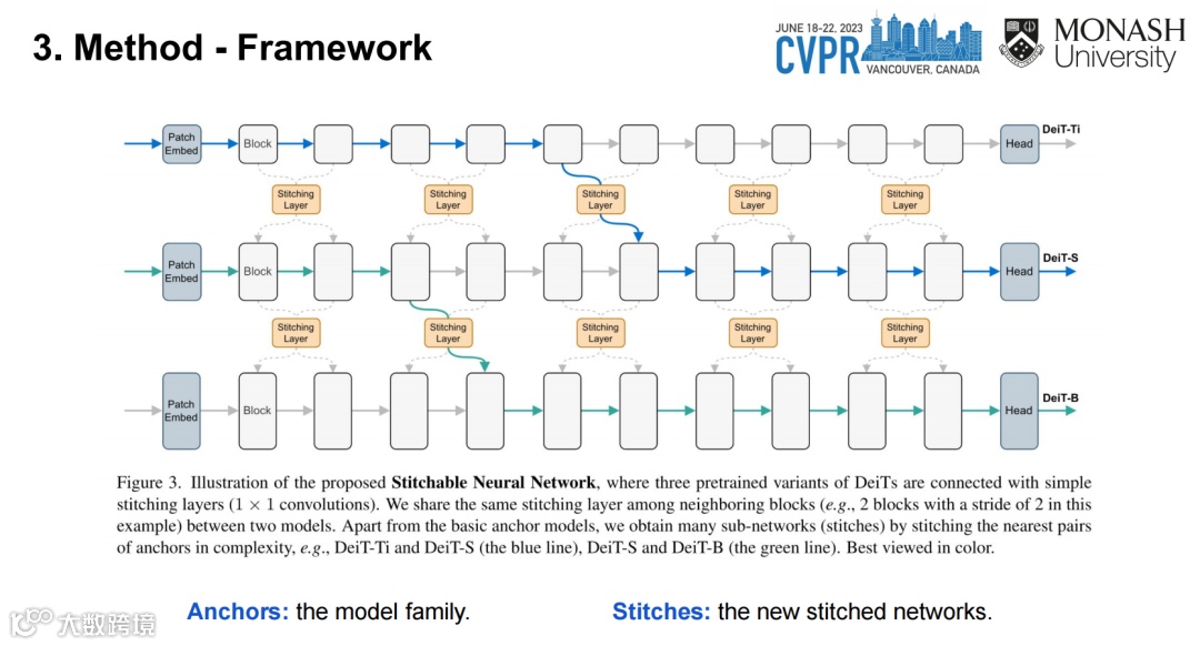 “在本次分享中,我们将介绍可缝合神经网络(Stitchable Neural Networks, 即SN-Net),一种全新的模型部署方法,利用现有的model family直接做少量epoch finetune就可以得到大量插值般存在的子网络,运行时任意切换网络结构满足不同resource constraint。在基于DeiT和Swin的缝合实验中,SN-Net表现出顺滑且强有力的FLOPs-accuracy曲线。”