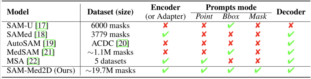 2.更全面的微调方案:相对于现有的医学SAM方法,作者对SAM的三个重要组成部分都进行了微调,使SAM-Med2D能够更好地适应医学图像的特殊特征和变化,提高分割结果的准确性和稳定性。图2对比了最近基于SAM的微调方法。