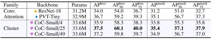 接下来,作者研究 Context Cluster 操作对下游任务的泛化性,包括 MS-COCO 目标检测和实例分割。检测头和实例分割头使用 Mask RCNN。所有模型使用 1× scheduler (12 epochs) 进行训练,并使用 ImageNet 预训练权重进行初始化。为了进行比较,作者将 ResNet 作为 ConvNets 的代表,PVT 作为 ViTs 的代表。
