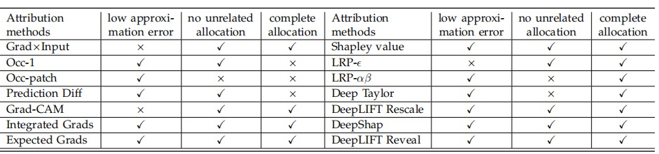 表 2. 总结 14 种不同归因算法是否满足三条可靠性评估准则。