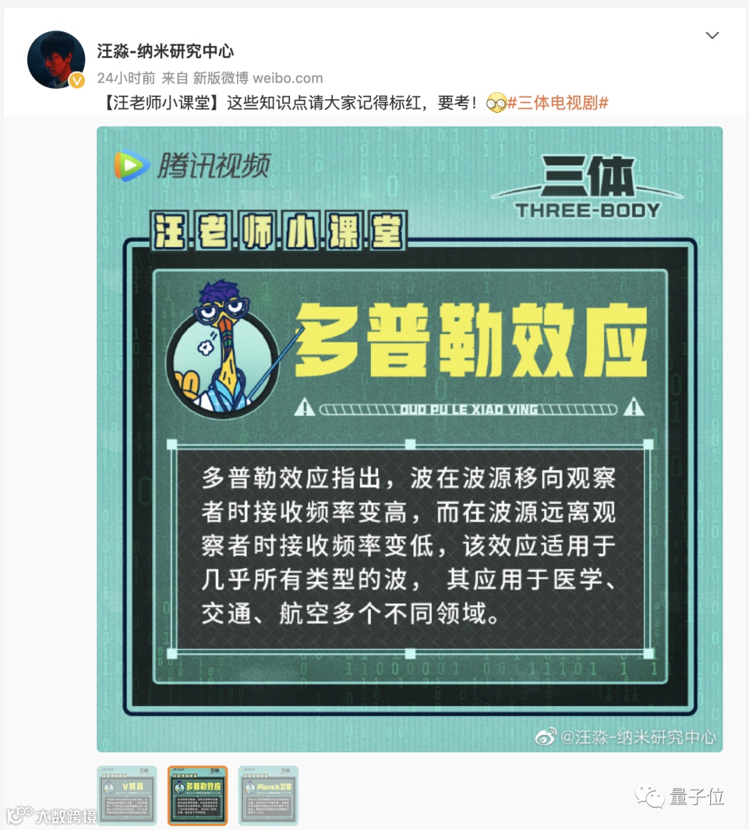 在剧中角色汪淼的微博账号上,每天都会有针对当天播出内容中的小卡片。