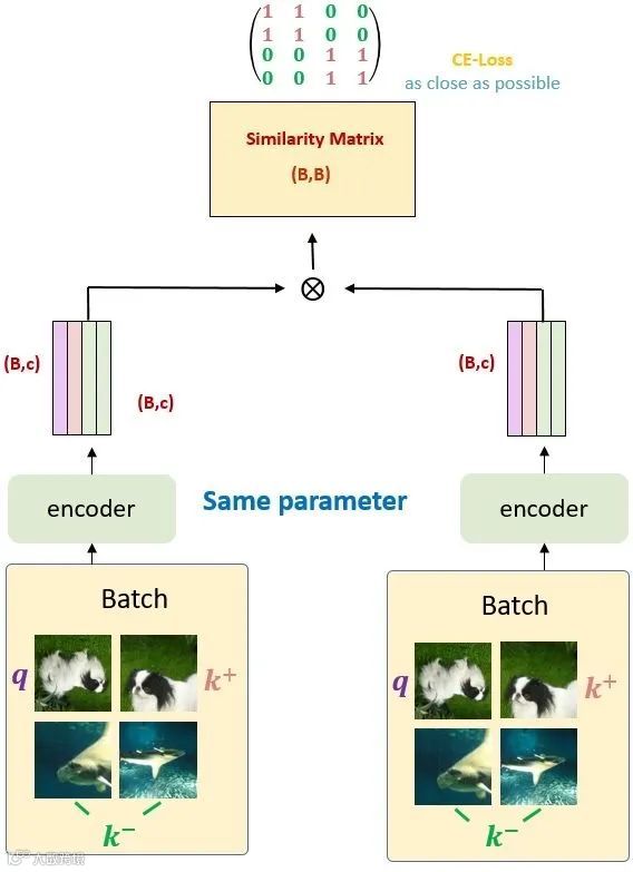 End-to-end 的方法 (原始的端到端自监督学习方法): 一个Batch的数据假设有 个 image,这里面有一个样本 query 和它所对应的正样本 , 和 来自同一张图片的不同的 Data Augmentation,这个Batch剩下的数据就是负样本 (negative samples),如下图3所示。接着我们将这个 Batch 的数据同时输入给2个架构相同但参数不同的 Encoder 和 Encoder 。然后对两个 Encoder的输出使用下式 1 所示的 Contrastive loss 损失函数使得query 和正样本 的相似程度尽量地高,使得query 和负样本 的相似程度尽量地低,通过这样来训练Encoder 和 Encoder ,这个过程就称之为自监督预训练。训练完毕后得到的 Encoder 的输出就是图片的 visual representation。这种方法的缺点是:因为Encoder 和 Encoder 的参数都是通过反向传播来更新的,所以 Batch size 的大小不能太大,否则 GPU 显存就不够了。所以,Batch size 的大小限制了负样本的数量,也限制了自监督模型的性能。