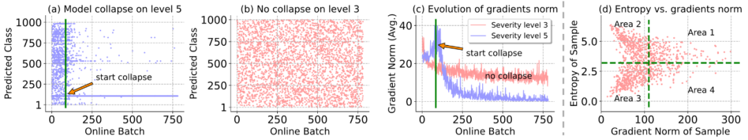 (2)在线熵最小化易将模型优化至退化的平凡解,即将任意样本预测到同一个类:根据图 6 (a) 和 (b) 显示,在分布偏移程度严重(level 5)时,在线自适应过程中突然出现了模型退化崩溃现象,即所有样本(真实类别不同)被预测到同一类;同时,模型梯度的 范数在模型崩溃前后快速增大而后降至几乎为 0,见图 6(c),侧面说明可能是某些大尺度 / 噪声梯度破坏了模型参数,进而导致模型崩溃。