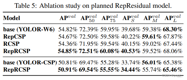 因为dark block和反向dark block的CSPDarknet具有完全相同的参数量和concat操作,所以比较起来相当公平。表5所示的实验结果完全证实了所提出的重参化策略对于residual的模型依旧有效。RepCSPResNet的设计也符合本文的设计模式。