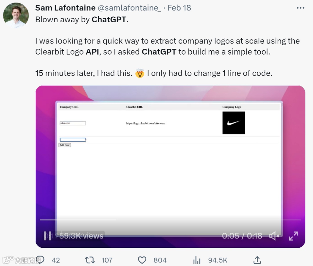 OpenAI 前脚刚官宣,后脚就有人直呼被 ChatGPT 的表现惊呆了。表示自己正在寻找一种快速的方法来提取公司的 logos ,让 ChatGPT 帮忙构建一个工具,仅仅过了 15 分钟 ChatGPT 就给出解决方案,自己只需改变一行代码就能使用。