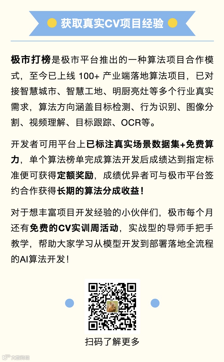 开发者报名极市打榜,可用平台上已标注真实场景数据集+免费算力,单个算法榜单完成算法开发后成绩达到指定标准便可获得定额奖励,成绩优异者可与极市平台签约合作获得长期的算法分成收益。